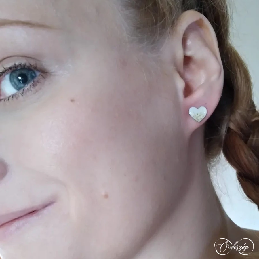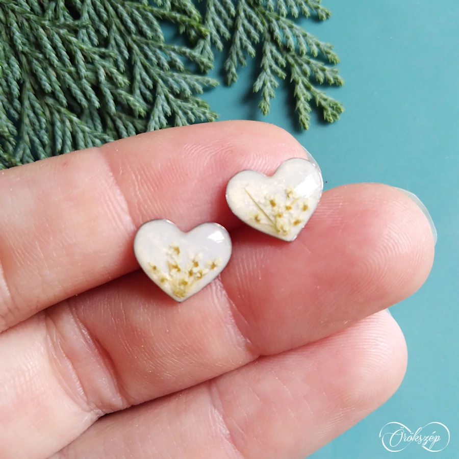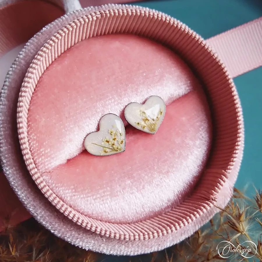 Klasszikus szív fazon egy csipetni természettel. A fehérarany fülbevalóban apró turbolyavirágokat rendeztem egy csokorba.