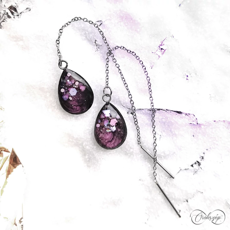 Antiallergén orvosi acél fülbevaló, mely a sötétpink árnyalataiban pompázik. Csillogó kagylóhéjak és csillámok emelik tovább az ékszer szépségét.