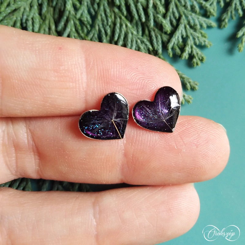 Klasszikus szív fazon egy csipetni természettel. Az irrizáló sötétkék fülbevalóban egy szál pitypangmag úszik sejtelmesen.