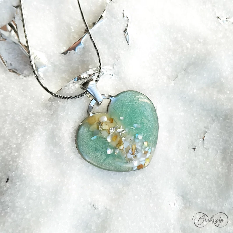 Antiallergén orvosi acél nyaklánc, mely a menta és arany árnyalataiban pompázik. Csillogó arany és ezüst pehely emeli tovább az ékszer szépségét.