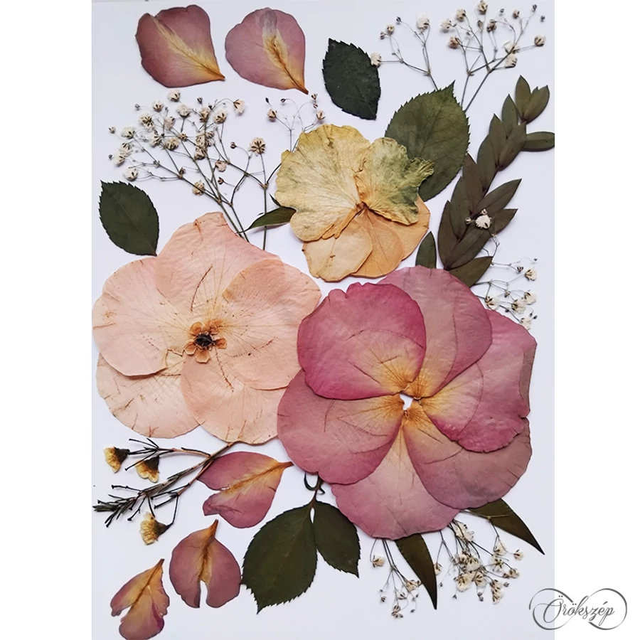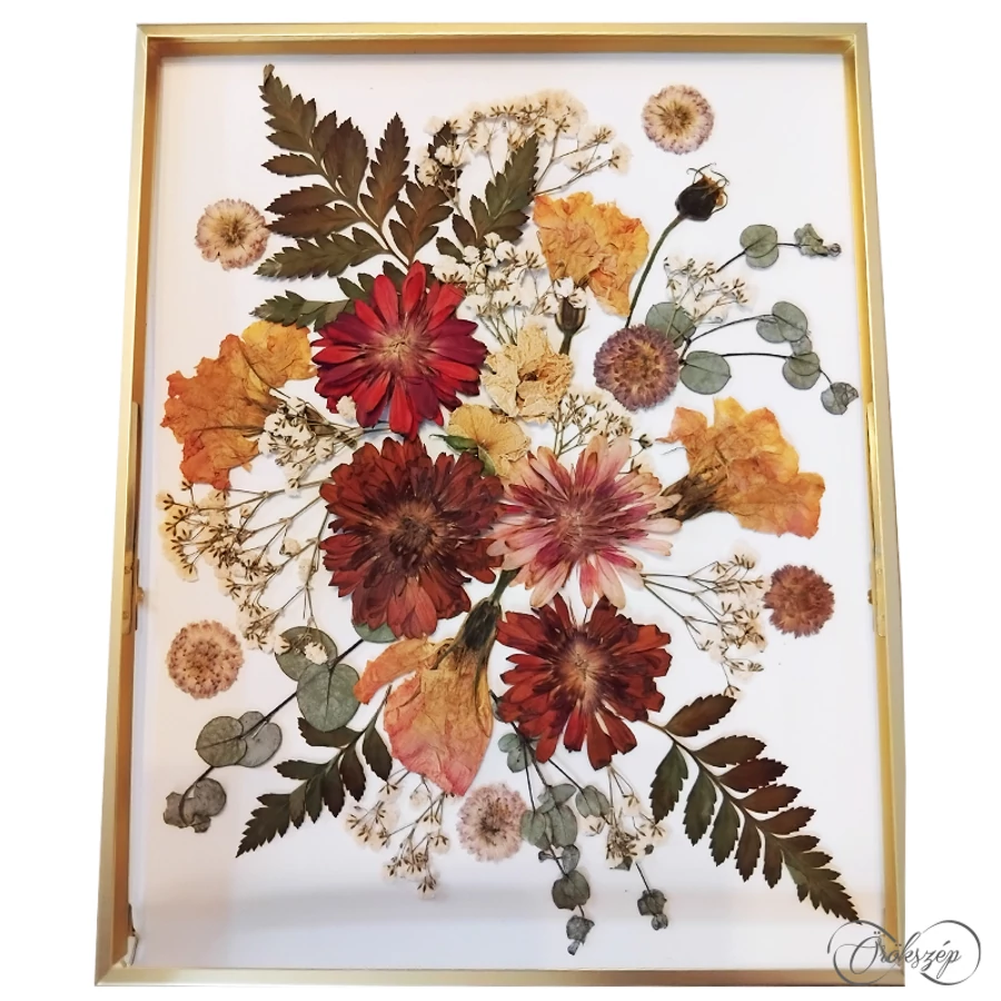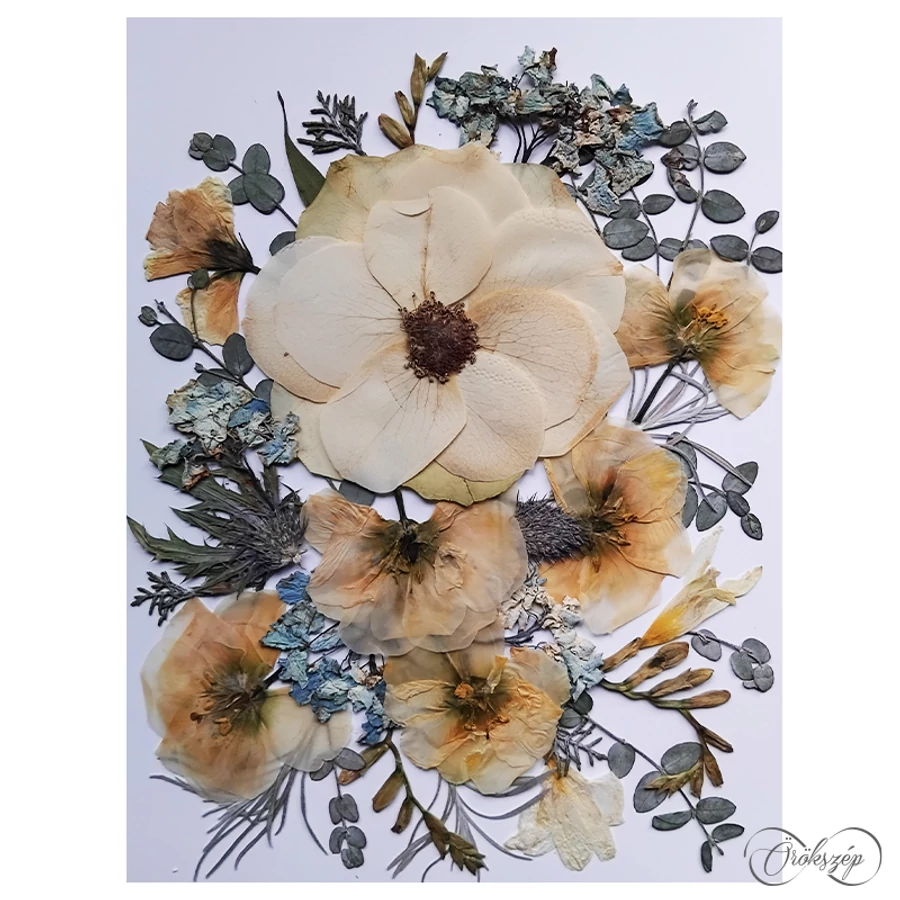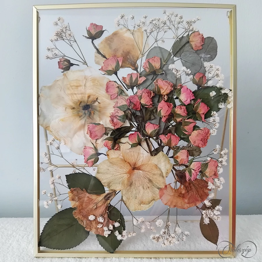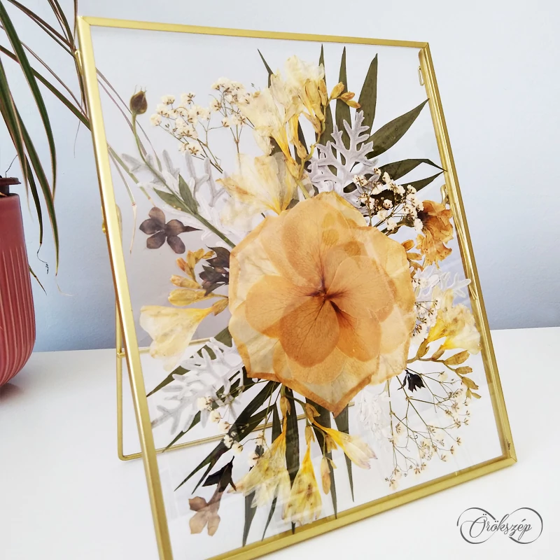 A virágokat laposra préselve kiszárítjuk, majd a friss csokor hangulatát idéző kompozíciót készítünk belül. A kép két üvegtiszta plexi lap közt elevenedik meg, ezáltal egy izgalmas lebegő dekorációt hozunk létre.
