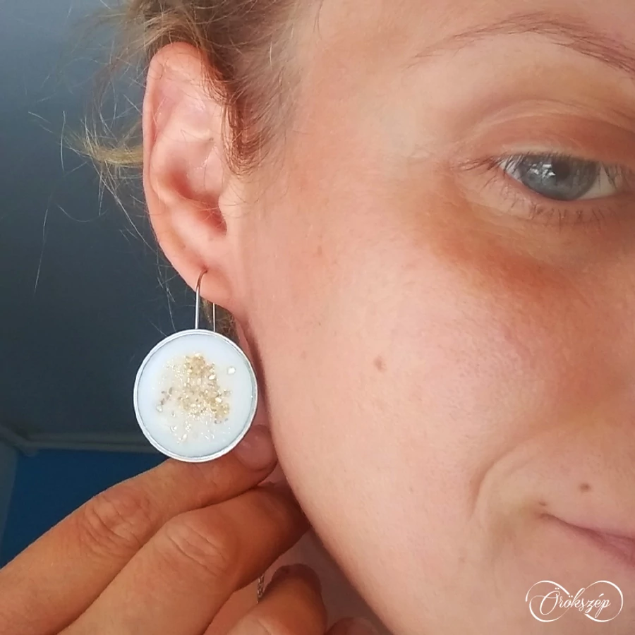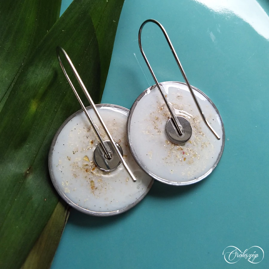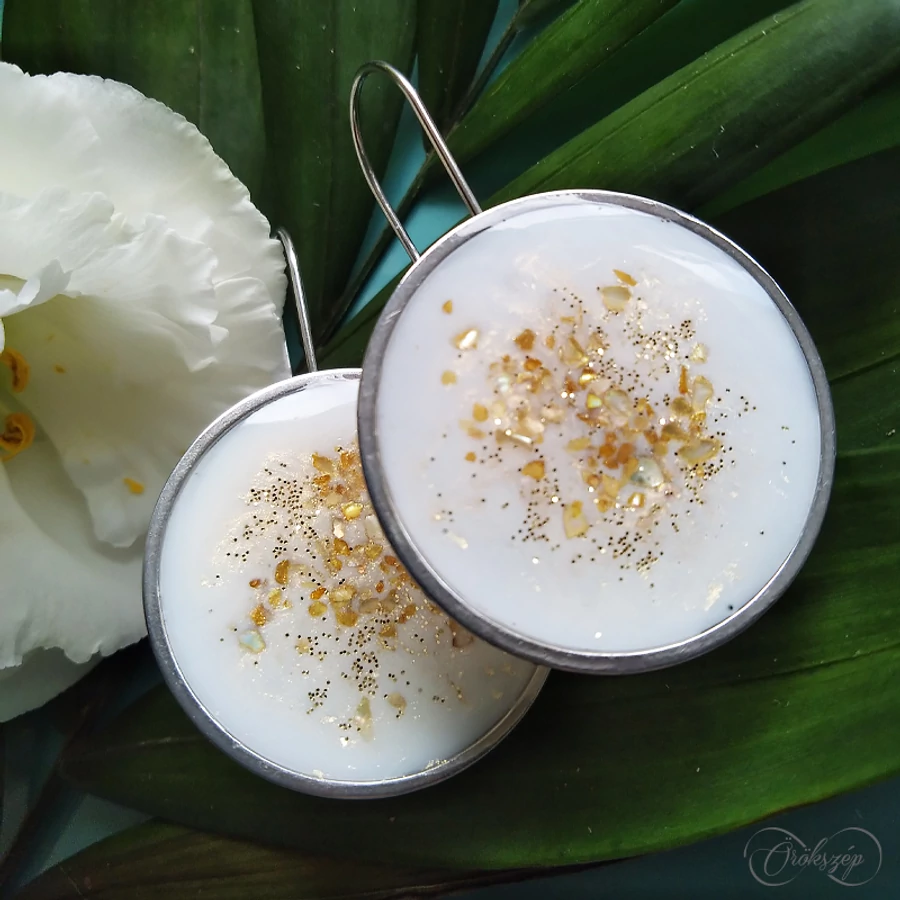 Hófehér gyantában apró arany kagylódarabkák ragyogása teszi elevenné és játékossá ezt a klasszikus, kör alakú fülbevalót. Az akasztója is egyedi, mivel a kör közepére illeszkedik, így igazán harmonikus összhatást nyújt.