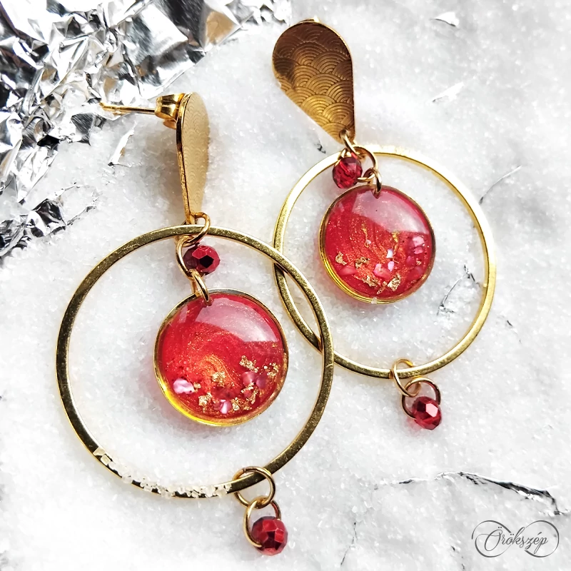 Antiallergén orvosi acél aranyozott fülbevaló, mely a tűzpiros árnyalataiban pompázik. Csillogó arany pehely és kagyló emeli tovább az ékszer szépségét.