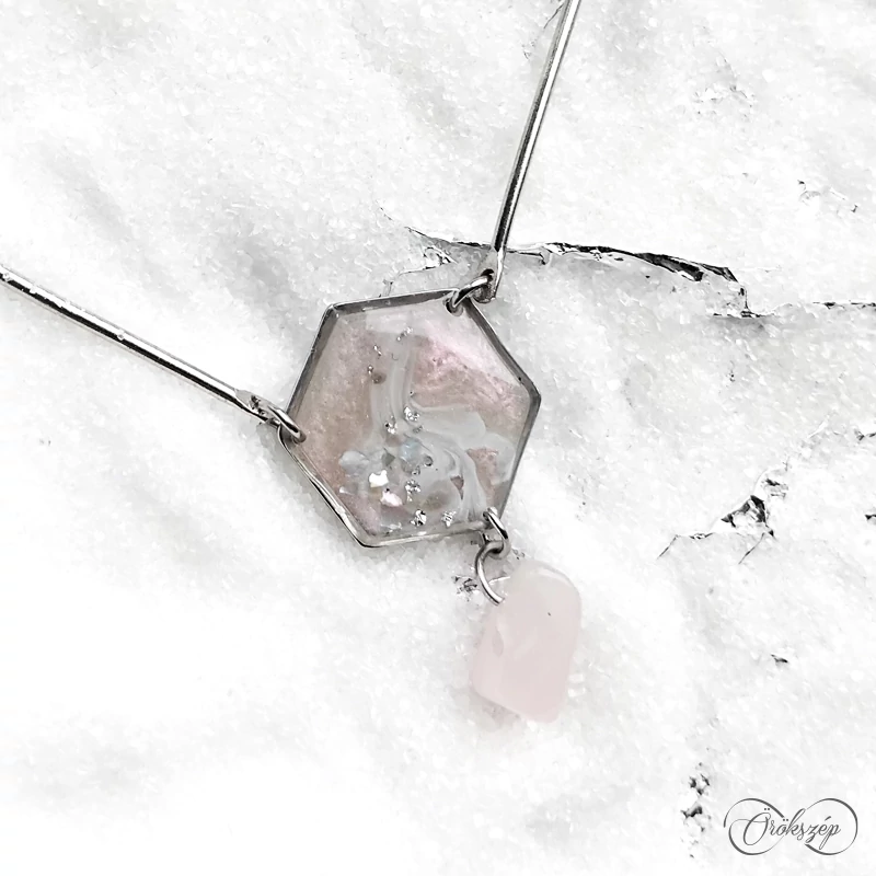 Antiallergén orvosi acél nyaklánc, mely a pasztell árnyalataiban pompázik. Rózsakvarc kövek emelik tovább az ékszer szépségét.