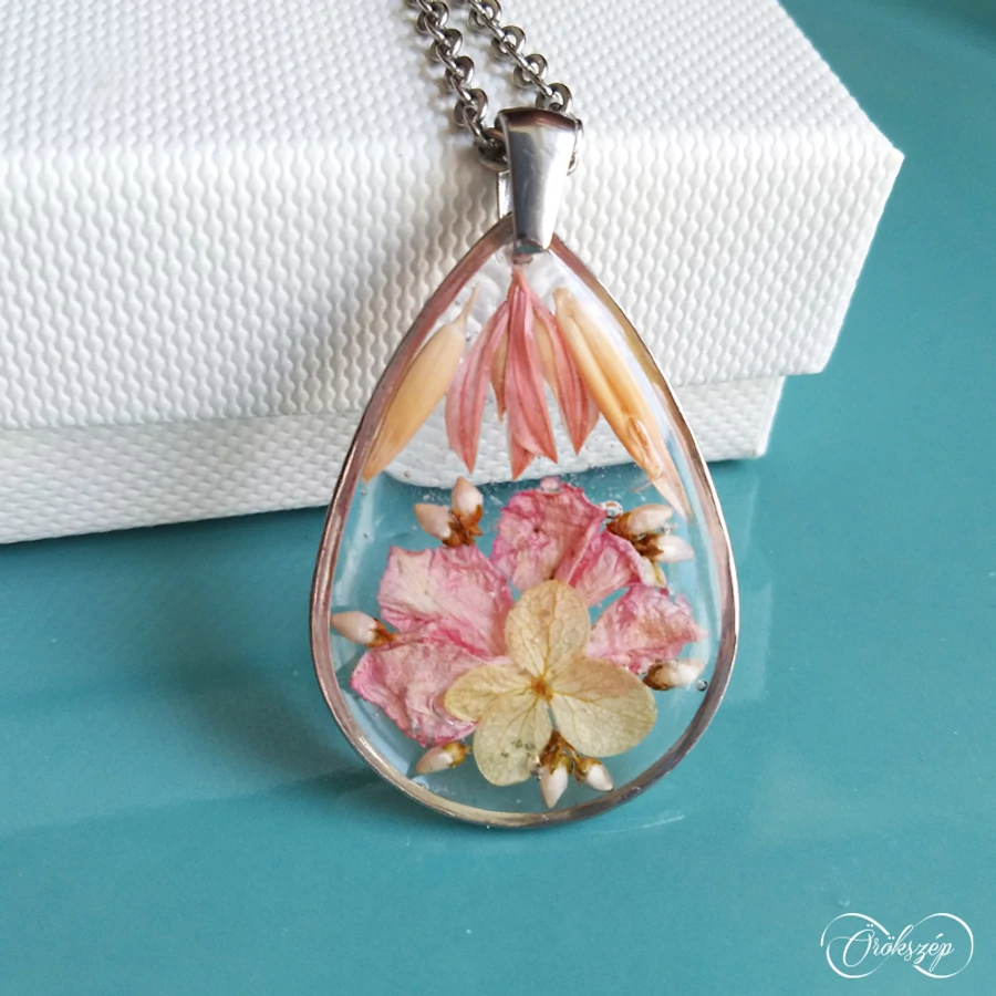 Romantikus stílusú nyaklánc, melyben pasztell árnyalatú virágok harmóniája elevenedik meg. A csepp fazonú nyakláncban hortenzia, fénymag és vékony hanga virágok találhatóak.