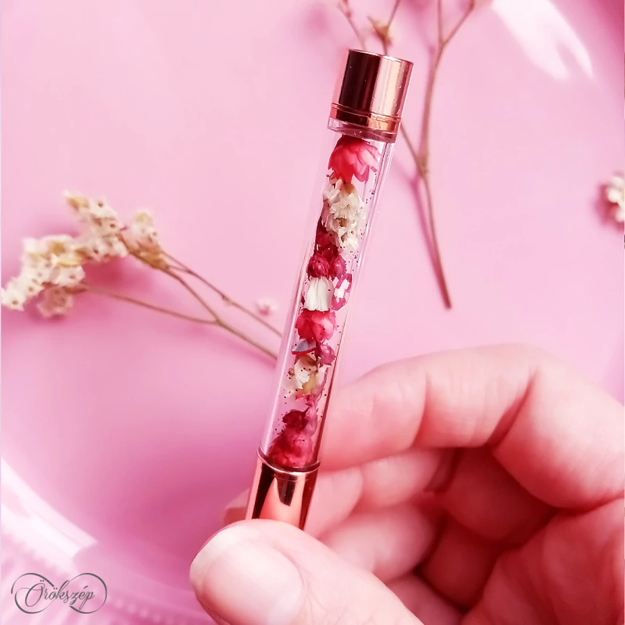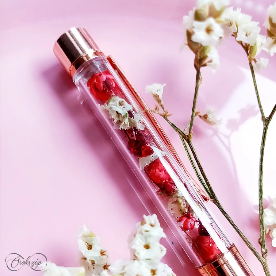 Csillogó glitterrel tarkított tűzpiros glixiák és fehér sóvirágok zuhataga, rubinvörös irrizáló strasszokkal bolondítva. A kompozíció a toll átlátszó tartályában aprólékos munkával lett elhelyezve a legszebb virágok felhasználásával.
